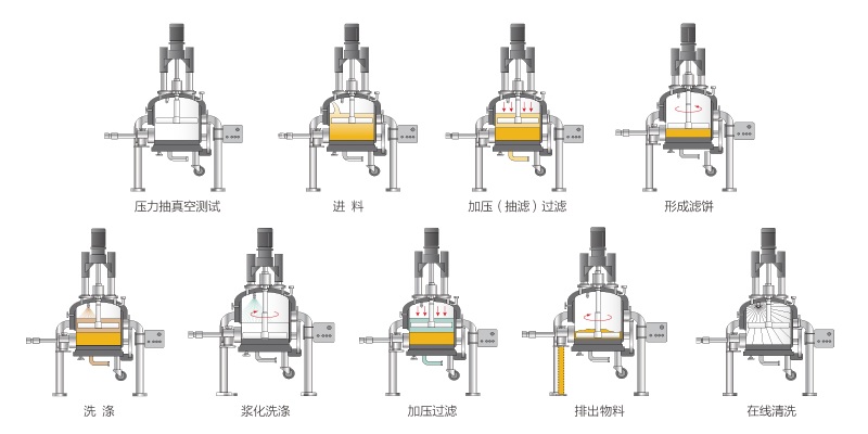 將上游反應(yīng)釜或結(jié)晶設(shè)備產(chǎn)生的固液混合物晶漿放料到三合一設(shè)備罐體內(nèi),以壓力差為推動(dòng)力實(shí)現(xiàn)固液混合物的過(guò)濾分離。實(shí)際應(yīng)用中有加壓壓濾、真空抽濾以及加壓抽真空組合形式過(guò)濾等。加壓壓濾采用潔凈的壓縮空氣、氮?dú)饣蚱渌栊詺怏w,具體應(yīng)根據(jù)固液混合物的特性選擇壓縮氣體。例如固液混合物易被氧化或固液混合物中有易爆介質(zhì),就不能采用壓縮空氣,而應(yīng)選用惰性氣體。根據(jù)實(shí)際經(jīng)驗(yàn),制藥行業(yè)一般產(chǎn)品壓濾壓力0.2~0.3MPa即可實(shí)現(xiàn)過(guò)濾,化工或食品行業(yè)一些產(chǎn)品需要較高的過(guò)濾壓力,有的壓力達(dá)到1.0MPa。