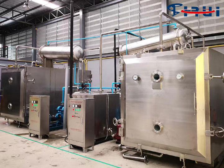 (1) 方形真空干燥機方形真空干燥機是在低于常壓的狀態(tài)下降低濕分的沸點,去除物料中的濕分,達到低溫干燥的目的。利用真空泵進行抽氣抽濕,使工作室內(nèi)形成真空狀態(tài),加快了干燥速度。